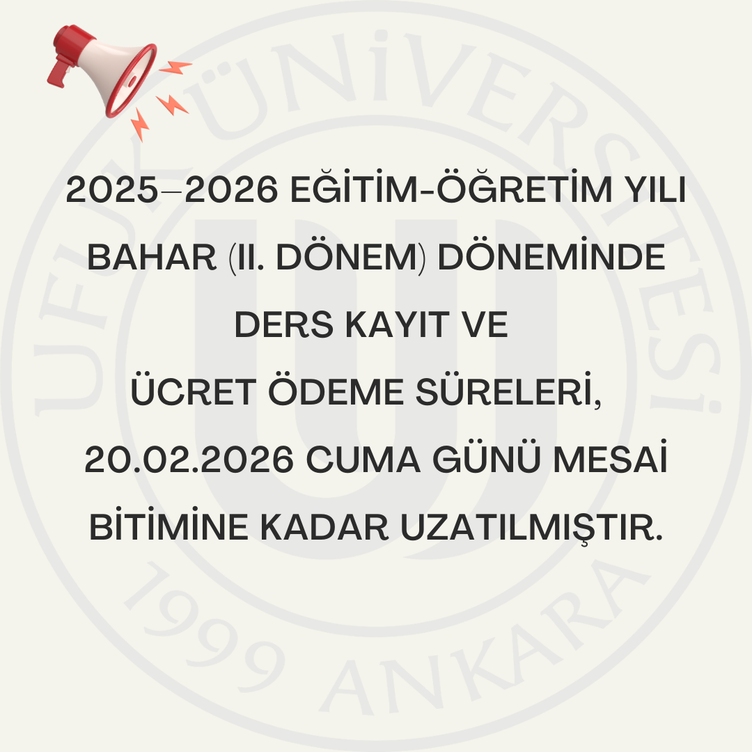 2025–2026 EĞİTİM-ÖĞRETİM YILI BAHAR (II. DÖNEM) DÖNEMİNDE DERS KAYIT VE ÜCRET ÖDEME SÜRELERİ 20.02.2026 CUMA GÜNÜ MESAİ BİTİMİNE KADAR UZATILMIŞTIR