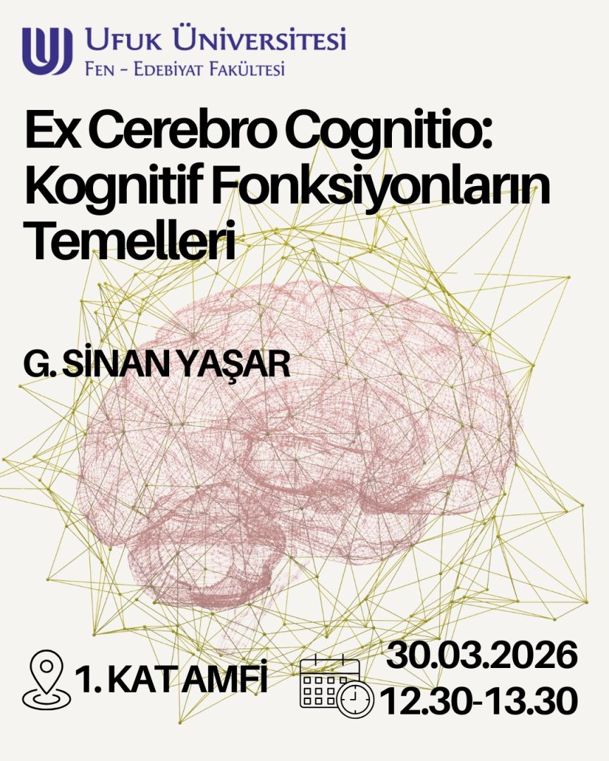 Ufuk Üniversitesi Fen-Edebiyat Fakültesi akademik etkinlikleri kapsamında; G. Sinan Yaşar tarafından gerçekleştirilecek olan "Ex Cerebro Cognitio: Kognitif Fonksiyonların Temelleri" başlıklı seminer, 30 Mart Pazartesi günü saat 12:30’da 1. Kat Amfi’de düzenlenecektir. Bilişsel işlevlerin nöro-bilişsel temellerinin akademik bir perspektifle ele alınacağı bu bilimsel oturuma tüm ilgililer davetlidir.